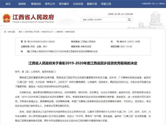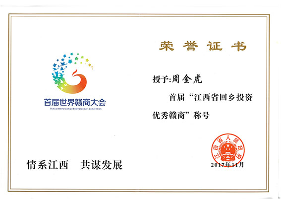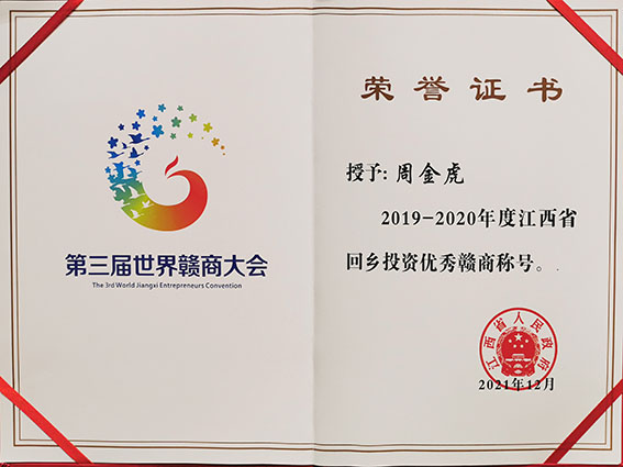 江西省政府為表彰先進(jìn),鼓勵(lì)更多的贛商回鄉(xiāng)創(chuàng)新創(chuàng)業(yè),對(duì)2019年-2020年回鄉(xiāng)投創(chuàng)奉獻(xiàn)的50名企業(yè)家授予“2019-2020年度江西省回鄉(xiāng)投資優(yōu)秀贛商”稱號(hào)。宏盛建業(yè)投資集團(tuán)董事長(zhǎng)、上海建業(yè)信息科技股份有限公司創(chuàng)始人周金虎已連續(xù)三次榮膺此稱號(hào)。
