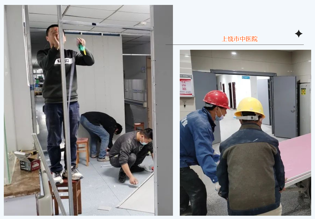 在上饒市人民醫(yī)院(城北分院)改造項(xiàng)目現(xiàn)場(chǎng),施工人員連續(xù)工作近20個(gè)小時(shí),從卸料進(jìn)場(chǎng)正式開(kāi)始,切割龍骨、固定龍骨、切割木板、固定墻板、打膠……所有人員一直奮戰(zhàn)到凌晨四點(diǎn)才結(jié)束。終于在4月30日如期完成任務(wù),達(dá)到防疫要求。