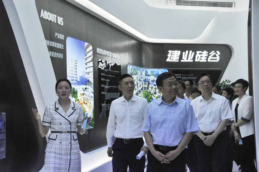 在建業(yè)硅谷總部經(jīng)濟(jì)園展廳,上饒市建筑科技產(chǎn)業(yè)園投資管理有限公司董事長(zhǎng)周金虎,向劉強(qiáng)主席簡(jiǎn)要匯報(bào)了建筑科技產(chǎn)業(yè)園項(xiàng)目自落戶上饒以來得到的政府支持以及所取得的成績(jī),并陪同觀看了宣傳視頻和展墻上相關(guān)板塊的介紹。