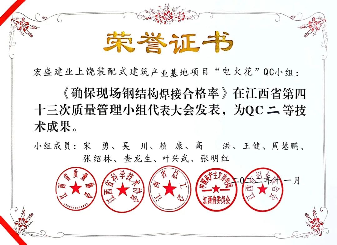 宏盛建業(yè)上饒裝配式建筑產業(yè)基地項目QC成果《確保現(xiàn)場鋼結構焊接合格率》榮獲二等技術成果獎