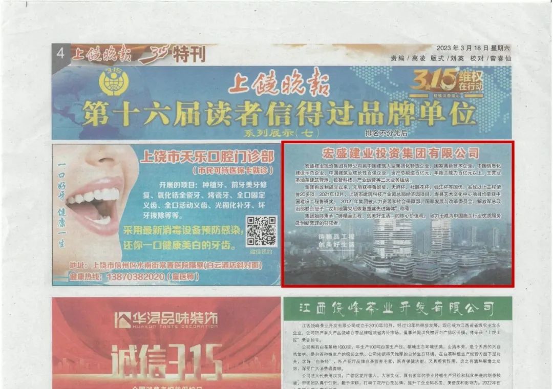 3月15日,上饒晚報(bào)授予宏盛建業(yè)投資有限集團(tuán)“上饒市誠(chéng)信企業(yè)”稱號(hào)。