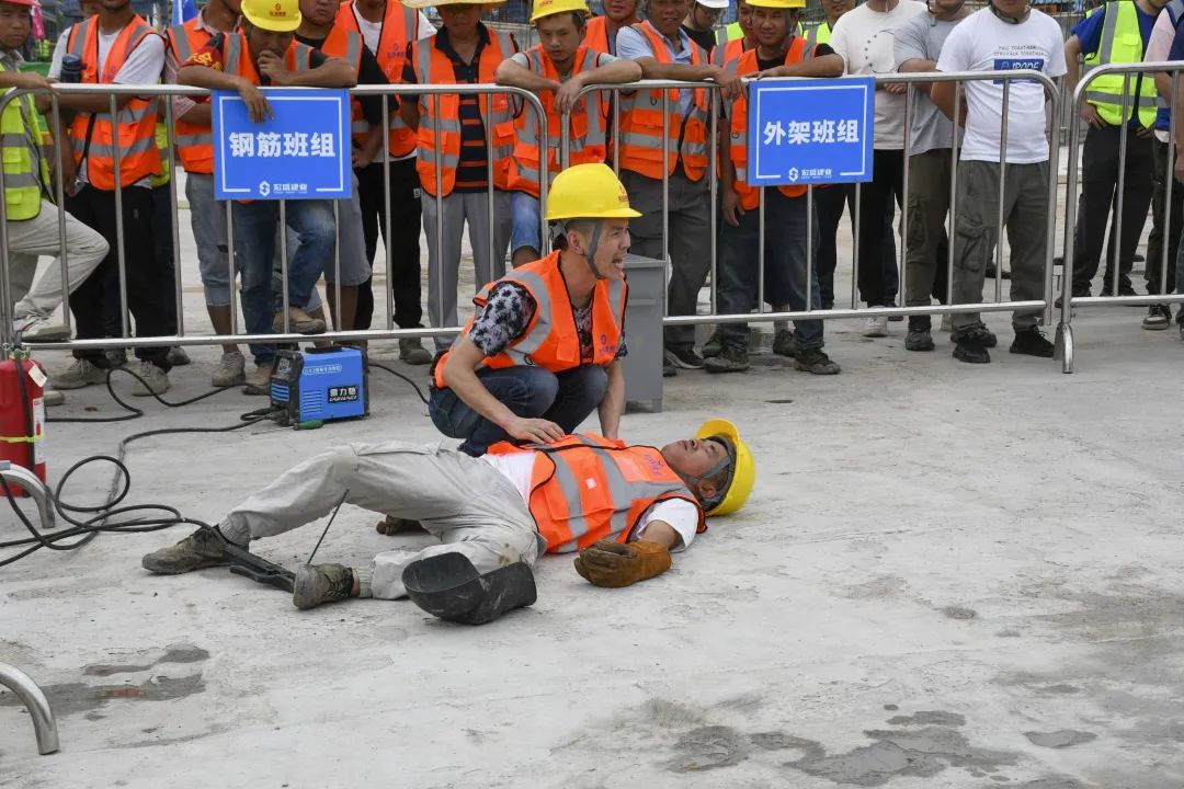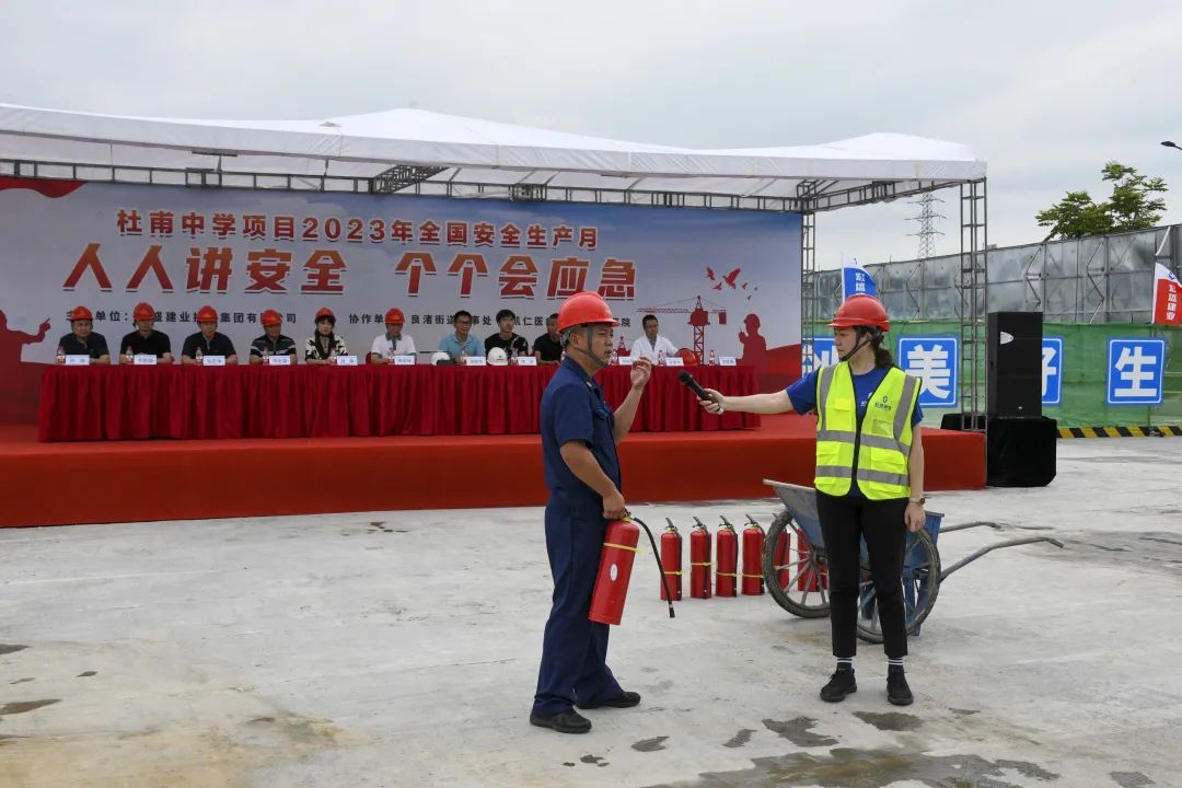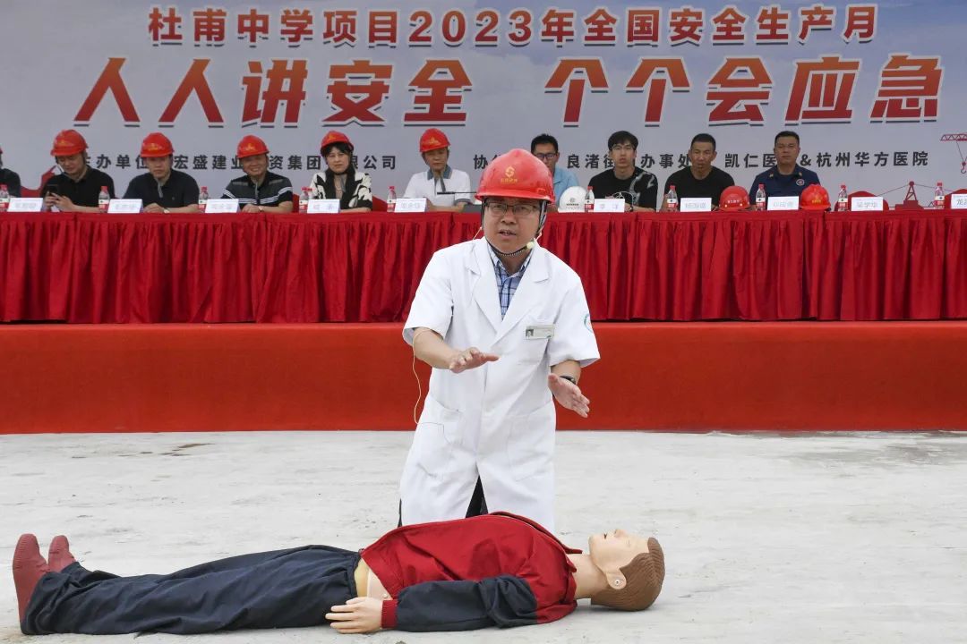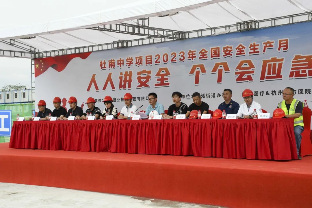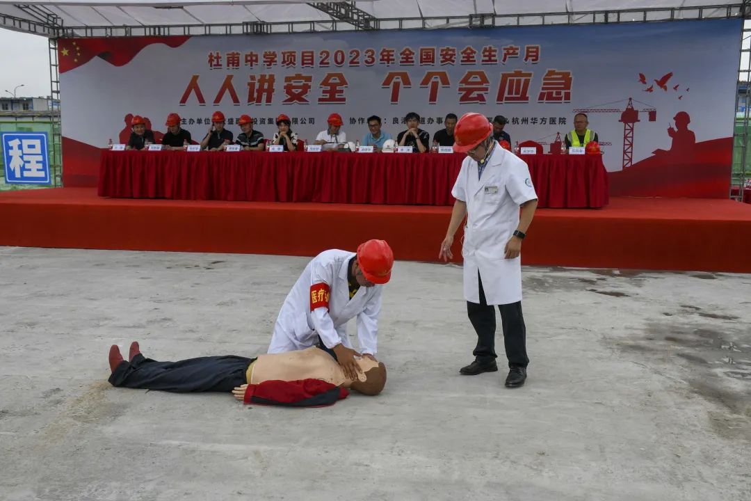 時值夏季,持續(xù)的高溫天氣給奮戰(zhàn)在一線的建筑工人帶來嚴峻考驗。為確保杜甫中學項目的安全生產工作順利開展,進一步提升全員應對突發(fā)事故的應變能力,6月20日,杜甫中學項目舉行事故應急救援演練,杭州良渚新城城建投資有限公司項目負責人凌錦華、杭州城投良渚新城開發(fā)有限公司項目負責人李洋、浙江嘉宇工程管理有限公司總監(jiān)理工程師楊國盛、良渚區(qū)域微型消防站站長鄧成勇、杭州華方醫(yī)院院長、主任醫(yī)師吳學華出席演練活動,集團副董事長、總裁周金旺,監(jiān)事長、審計中心總經(jīng)理成承等核心高管代表一同出席,各參會代表與項目各方代表一同列隊參加。