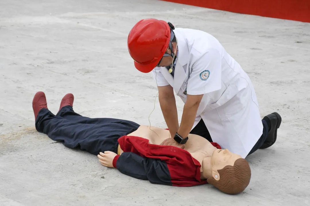 演練共分三個環(huán)節(jié),分別是消防滅火器使用培訓、常用醫(yī)療應急處理培訓和高溫中暑應急演練。
