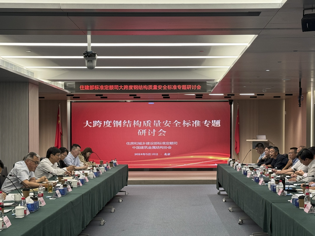 導(dǎo)讀:近年來(lái),受自然災(zāi)害和極端氣候影響,大跨度鋼結(jié)構(gòu)建 筑在使用中發(fā)生了多起重大質(zhì)量安全事故,人?生命財(cái)產(chǎn)遭受嚴(yán)重?fù)p失,政府、社會(huì)高度關(guān)注 。5月10日上午,受住建部委托,中國(guó)建筑金屬結(jié)構(gòu)協(xié)會(huì)在北京組織鋼結(jié)構(gòu)工程設(shè)計(jì)、 生產(chǎn)、施工和監(jiān)理單位有關(guān)知名的專家、學(xué)者召開大跨度鋼結(jié)構(gòu)質(zhì)量安全標(biāo)準(zhǔn)專題研討會(huì),住建部標(biāo)準(zhǔn)定額司、質(zhì)量安全監(jiān)管司、標(biāo)準(zhǔn)定額所和建筑結(jié)構(gòu)專業(yè)技術(shù)標(biāo)準(zhǔn)化委員會(huì)等領(lǐng)導(dǎo)出席會(huì)議,集團(tuán)副董事長(zhǎng)、總裁周金旺應(yīng)邀參加此次研討會(huì)。