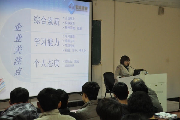 講座首先播放集團宣傳片,隨后張經(jīng)理從企業(yè)的角度,闡述施工企業(yè)尤其是民營企業(yè)對招聘應屆生的要求,她從綜合素質(zhì)、學習能力、職業(yè)心態(tài)三方面入手,希望同學們錘煉勤學苦練、吃苦耐勞的精神,學會適應施工企業(yè)文化和建筑行業(yè)特性。同時她還引用實例為提供同學們職業(yè)發(fā)展的建議。最后,她還在現(xiàn)場發(fā)布了集團2015年招聘計劃,希望有更多大學生加入宏盛大家庭。
