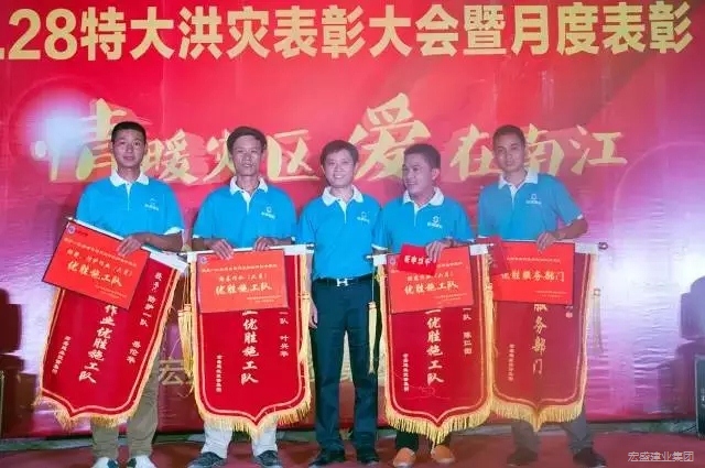 災(zāi)害面前,宏盛人挺身而出。災(zāi)難發(fā)生時,項目指揮部立即啟動抗洪搶險緊急預(yù)案,調(diào)度全部力量奔赴前線參與抗洪,竭盡所能地給予他們生活上的幫扶,特別在項目部生產(chǎn)經(jīng)理李忠德的帶領(lǐng)下,當日連續(xù)冒雨9小時搶通通往上兩鄉(xiāng)、關(guān)壩鄉(xiāng)上萬人的生命通道,南江縣人民多次稱贊到:“宏盛沒有做不到的事情!”。路基三隊的工友們在搶險自救的同時還幫扶周圍的村民為他們提供物資。橋梁一隊沈敦民在巡查險情時,幫助一個即將落水的小女孩,避免了一場意外的發(fā)生。為了表示對宏盛人的感謝,南江縣橋亭鄉(xiāng)鳳凰村的村委會代表及被救小女孩的一家人,特地為集團公司送上了“抗洪賑災(zāi)義伸援手,攜手共建和諧社會”的錦旗。