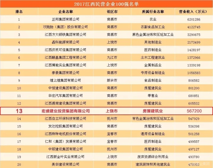 10月26日,由江西省人民政府新聞辦、江西省工商聯(lián)主辦的“2017江西民營(yíng)企業(yè)100強(qiáng)”發(fā)布會(huì)在南昌市召開。會(huì)上,省工商聯(lián)發(fā)布了2017江西民營(yíng)企業(yè)100強(qiáng)。集團(tuán)公司以年?duì)I業(yè)收入56億元入圍百強(qiáng)名單,名列榜單第十三。在整個(gè)江西省建筑民營(yíng)企業(yè)位列第二,上饒市民營(yíng)企業(yè)中排名第三。