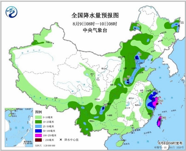 預(yù)計(jì),9日08時(shí)至10日08時(shí),黑龍江東部、華北東部、河南北部、江南東部、四川盆地南部、臺(tái)灣島等地的部分地區(qū)有大到暴雨,其中浙江東部、臺(tái)灣島的部分地區(qū)有大暴雨,局地特大暴雨。10日08時(shí)至11日08時(shí),華北東部、黃淮中東部、江淮東部、江南東部等地部分地區(qū)有大到暴雨,其中山東半島東南部、江蘇南部、浙江東部等部分地區(qū)有大暴雨,浙江東部、山東半島東南部沿海局地特大暴雨。