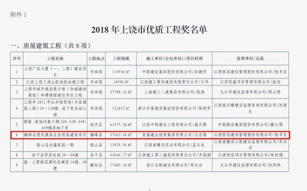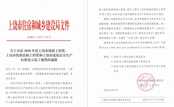近日,從上饒市住建局文件(饒建發(fā)﹝2019﹞194號(hào))獲悉,上饒市住房和城鄉(xiāng)建設(shè)局對(duì)上饒市優(yōu)質(zhì)工程進(jìn)行表彰通報(bào),宏盛建業(yè)承建的三項(xiàng)優(yōu)質(zhì)工程受到表彰。
