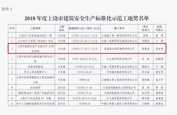 據(jù)了解,本次共通報(bào)表彰了2018年度上饒市優(yōu)質(zhì)工程獎(jiǎng)14項(xiàng),2018年度上饒市優(yōu)質(zhì)結(jié)構(gòu)工程獎(jiǎng)47項(xiàng),2018年度上饒市建筑安全生產(chǎn)標(biāo)準(zhǔn)化示范工地獎(jiǎng)30項(xiàng)。