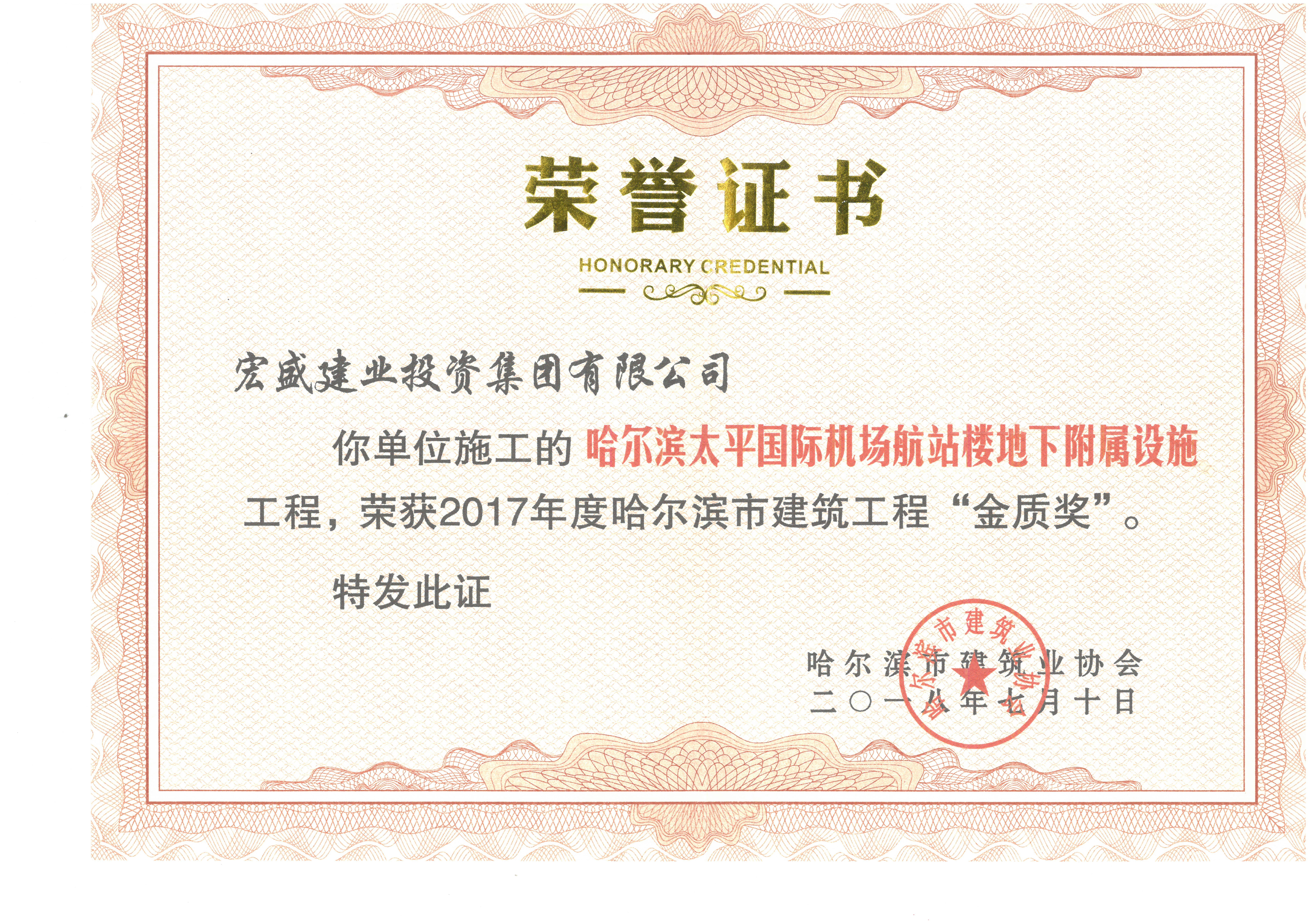 2017年哈爾濱市建設(shè)工程工程“金質(zhì)獎(jiǎng)”