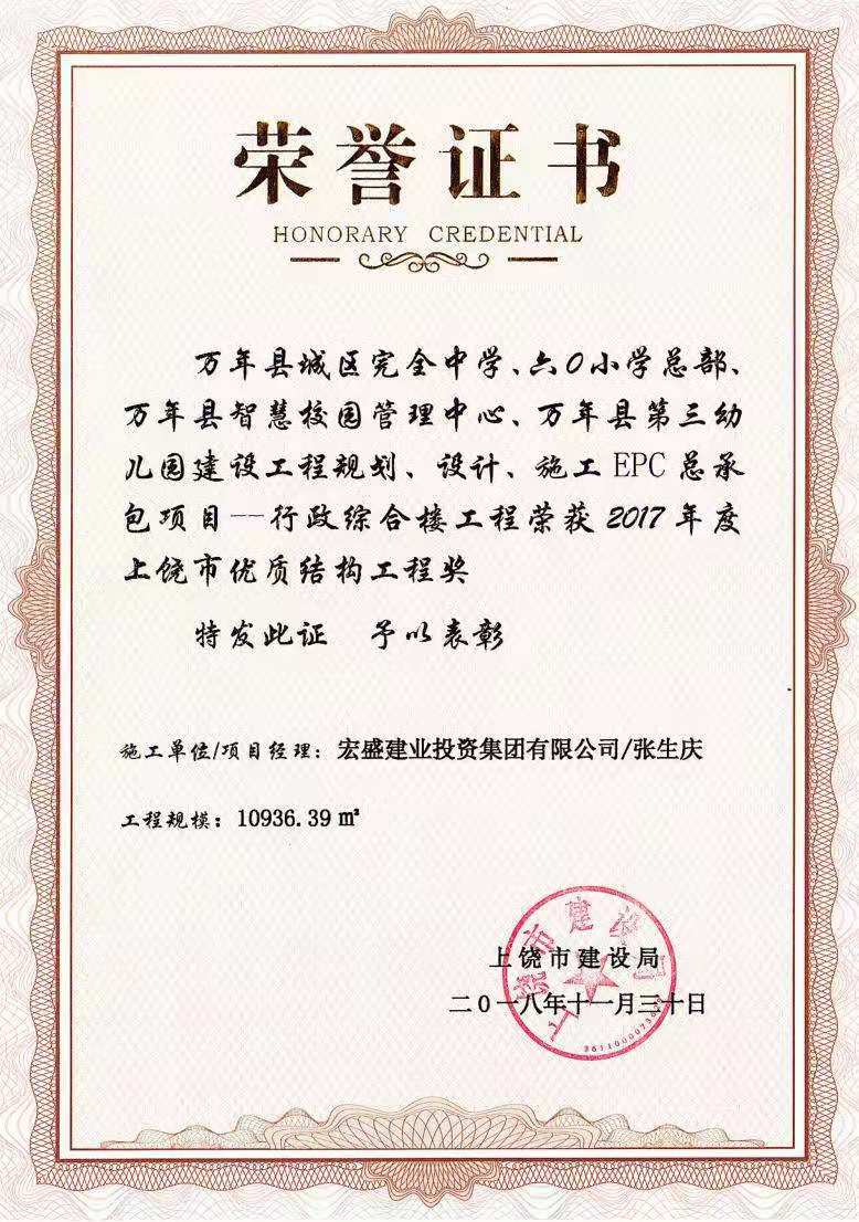 2017年度上饒市優(yōu)質(zhì)結(jié)構(gòu)工程獎(jiǎng)