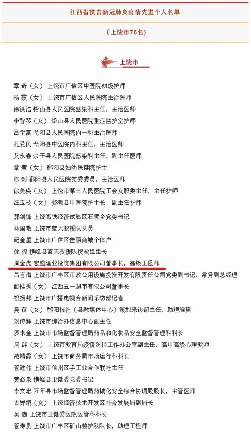 宏盛建業(yè)董事長周金虎獲評“江西省抗擊新冠肺炎疫情先進個人”