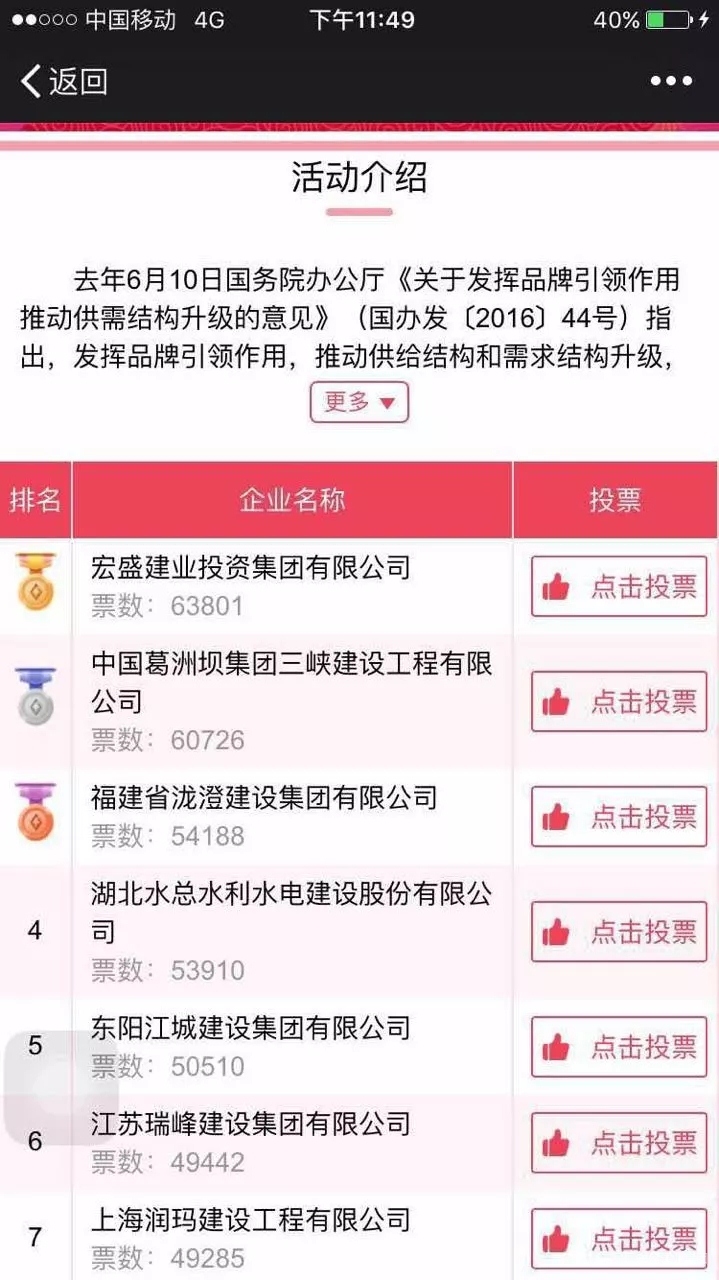 這次投票活動由百聯(lián)建筑網發(fā)起,從11月1日開始至7日結束。在為期一周的投票活動中,宏盛人團結一心,拼搏進取,勇爭第一,表現(xiàn)出強烈的責任感、榮譽感和過硬的戰(zhàn)斗力。在排名一度落后的情況下,大家紛紛行動起來,發(fā)動身邊親朋好友,通過微信群、朋友圈,廣泛號召,參與其中。從集團高管到各分、子公司、各自營項目負責人,大家?guī)ь^宣傳,積極投票,有的直到深夜還在關注投票進程。最后一天投票中,許多員工守到子夜時分,待投票活動結束才休息。