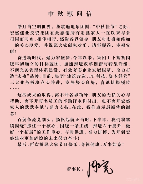 中秋佳節(jié)之際,宏盛建業(yè)向大家發(fā)來節(jié)日慰問。