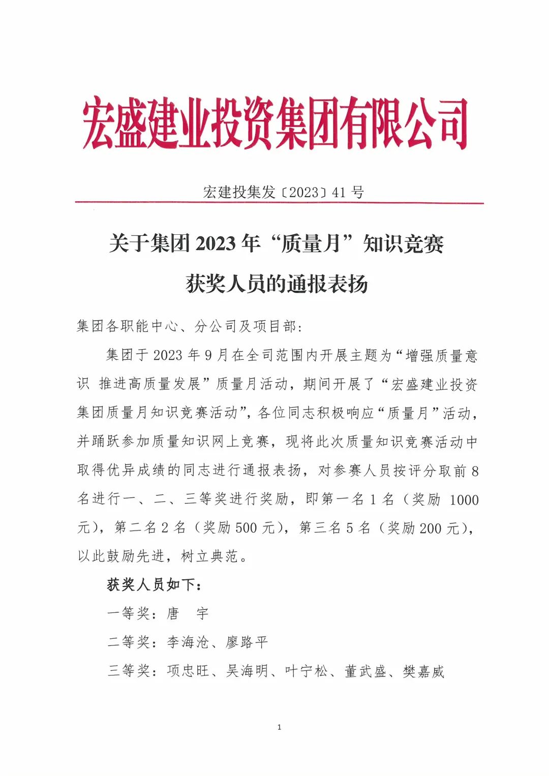 由宏盛項目管理中心牽頭舉辦了質量管理線上知識競賽,本次活動吸引了上百位宏盛項目管理人員的參與。公司對此次質量知識競賽活動中取得優(yōu)異成績的同志進行通報表揚并予以現(xiàn)金獎勵.