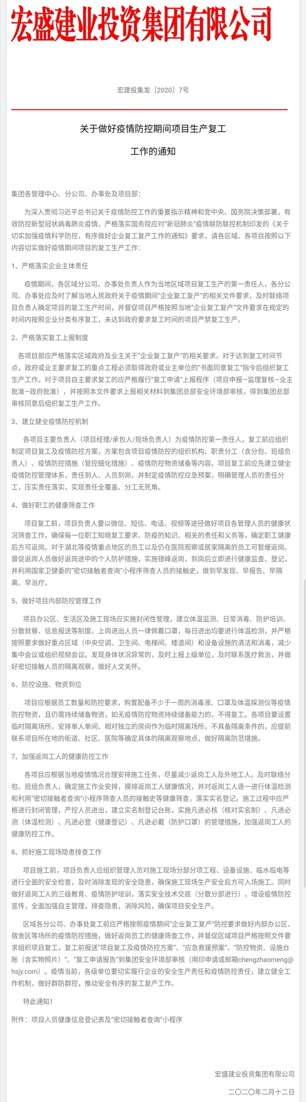 為切實(shí)履行企業(yè)的安全生產(chǎn)責(zé)任和疫情防控責(zé)任,建立健全工作機(jī)制,做好群防群控,推動(dòng)安全有序的復(fù)工復(fù)產(chǎn)工作,集團(tuán)專門下發(fā)了《關(guān)于做好疫情防控期間項(xiàng)目生產(chǎn)復(fù)工工作的通知 》,明確要嚴(yán)格落實(shí)企業(yè)主體責(zé)任和復(fù)工上報(bào)制度,建立健全疫情防控機(jī)制,認(rèn)真做好職工的健康篩查、項(xiàng)目?jī)?nèi)部防控管理、抓好施工現(xiàn)場(chǎng)隱患排查工作,加強(qiáng)返崗工人的健康防控,確保防控設(shè)施、物資到位。