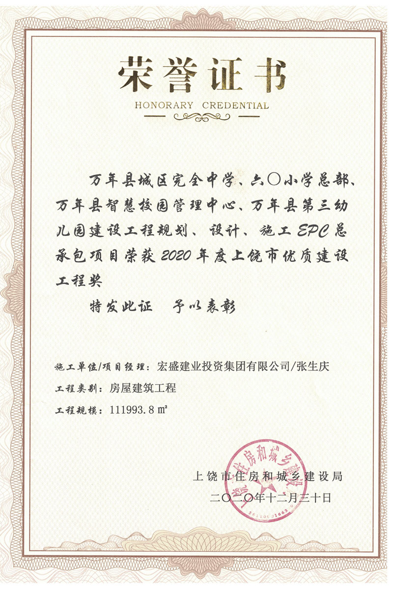 萬(wàn)年縣城區(qū)完全中學(xué)、六〇小學(xué)總部、萬(wàn)年縣智慧校園管理中心、萬(wàn)年縣第三幼兒園建設(shè)工程規(guī)劃、設(shè)計(jì)、施工EPC總承包項(xiàng)目榮獲“2020年度上饒市優(yōu)質(zhì)建設(shè)工程獎(jiǎng)”;