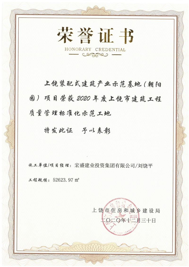 上饒裝配式建筑產(chǎn)業(yè)示范基地(朝陽(yáng)園)項(xiàng)目榮獲“2020年度上饒市建筑工程質(zhì)量管理標(biāo)準(zhǔn)化示范工地”。