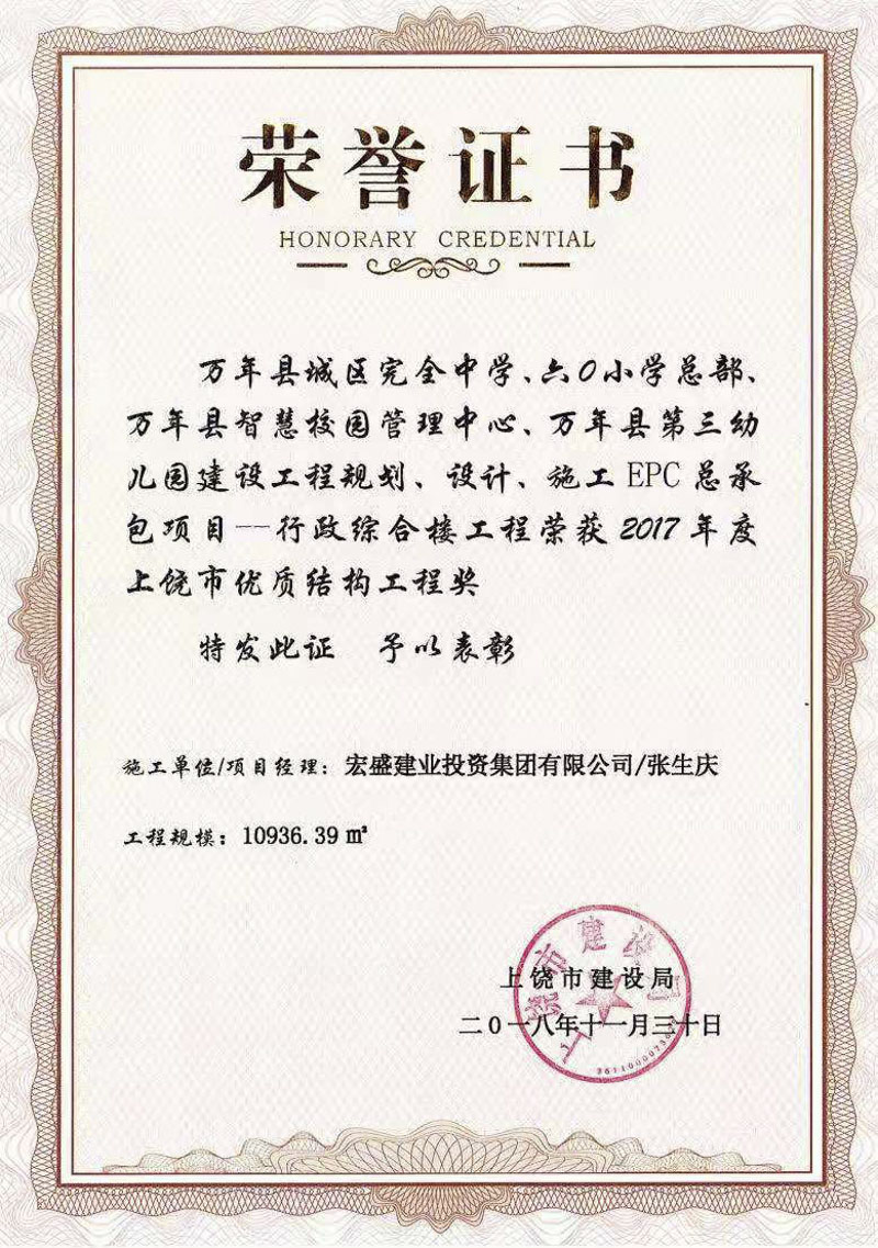 2017年5月至2018年10月參與萬(wàn)年縣城區(qū)完全中學(xué)、六0小學(xué)總部建設(shè)工程項(xiàng)目,項(xiàng)目榮獲2017年度上饒市優(yōu)質(zhì)結(jié)構(gòu)工程獎(jiǎng)