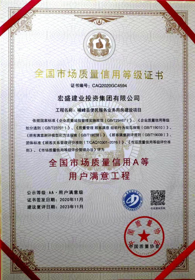 2018年10月-12月參與橫峰縣便民服務(wù)業(yè)務(wù)用房建設(shè)項(xiàng)目,項(xiàng)目獲評(píng)全國(guó)市場(chǎng)質(zhì)量信用A等 用戶滿意工程
