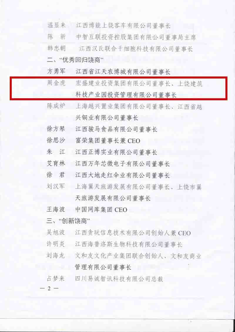 Guide:宏盛建業(yè)投資集團(tuán)董事長(zhǎng)周金虎榮獲“優(yōu)秀回歸饒商”榮譽(yù)稱號(hào)。 ??