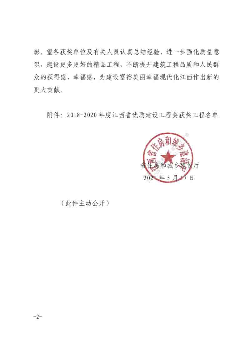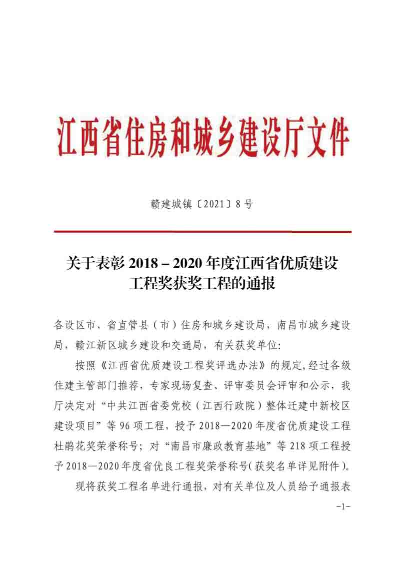 公布2020年度江西省優(yōu)質建設工程獎