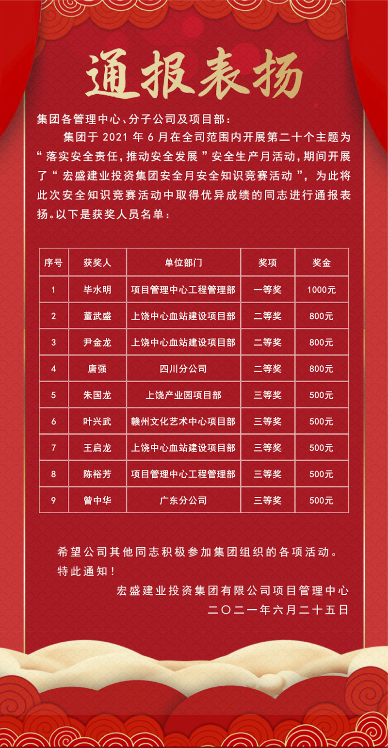 集團(tuán)于2021年6月在全司范圍內(nèi)開展第二十個(gè)主題為“落實(shí)安全責(zé)任,推動(dòng)安全發(fā)展”安全生產(chǎn)月活動(dòng),期間開展了“宏盛建業(yè)投資集團(tuán)安全月安全知識(shí)競(jìng)賽活動(dòng)”,本次活動(dòng)有超過100位員工參加了在線考試,他們是集團(tuán)所屬所有項(xiàng)目管理人員,所有項(xiàng)目工程管理派駐人員,所有分公司工程部管理人員。員工們?cè)鷮?shí)的安全知識(shí)為他們?nèi)〉昧瞬诲e(cuò)的成績(jī),對(duì)這些優(yōu)秀的員工公司也對(duì)他們進(jìn)行了獎(jiǎng)勵(lì)。