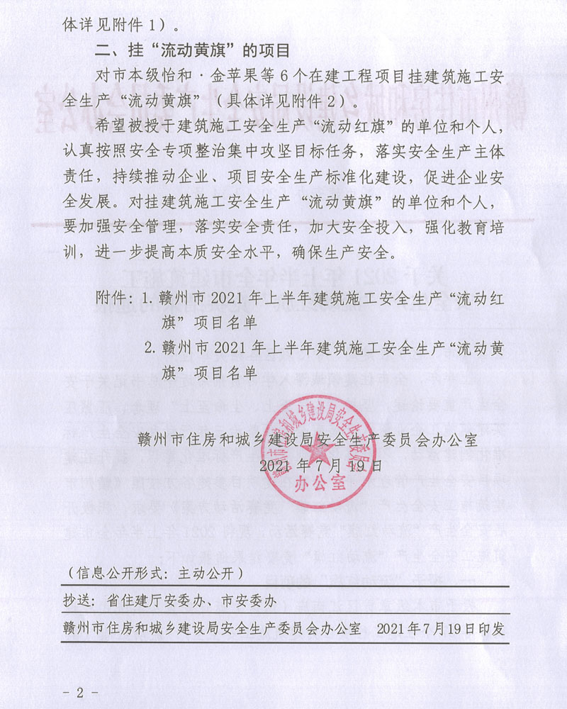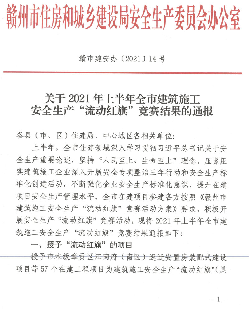 Guide:近日,從贛市建安辦文件[2021]14號(hào)文件《關(guān)于2021年上半年全市建筑施工安全生產(chǎn)“流動(dòng)紅旗”競(jìng)賽結(jié)果的通報(bào)》獲悉,集團(tuán)建設(shè)項(xiàng)目贛州經(jīng)開(kāi)區(qū)文化藝術(shù)中心建設(shè)項(xiàng)目(A、C地塊)榮獲贛州市2021年上半年建筑施工安全生產(chǎn)“流動(dòng)紅旗”獎(jiǎng)項(xiàng)。