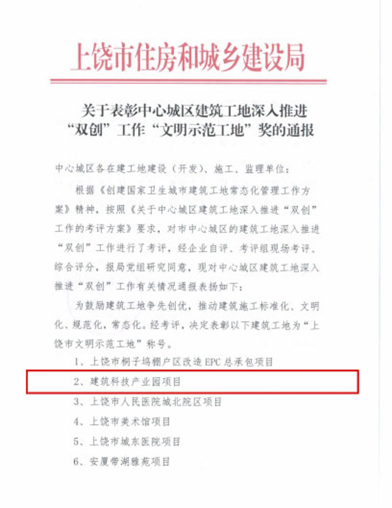 集團(tuán)投資承建上饒市建筑科技產(chǎn)業(yè)園項(xiàng)目獲評上饒市文明示范工地